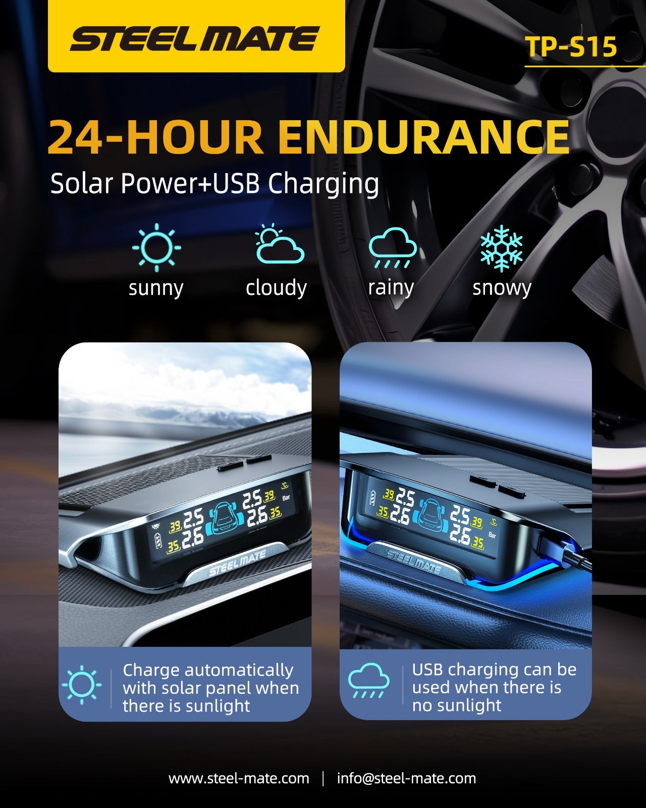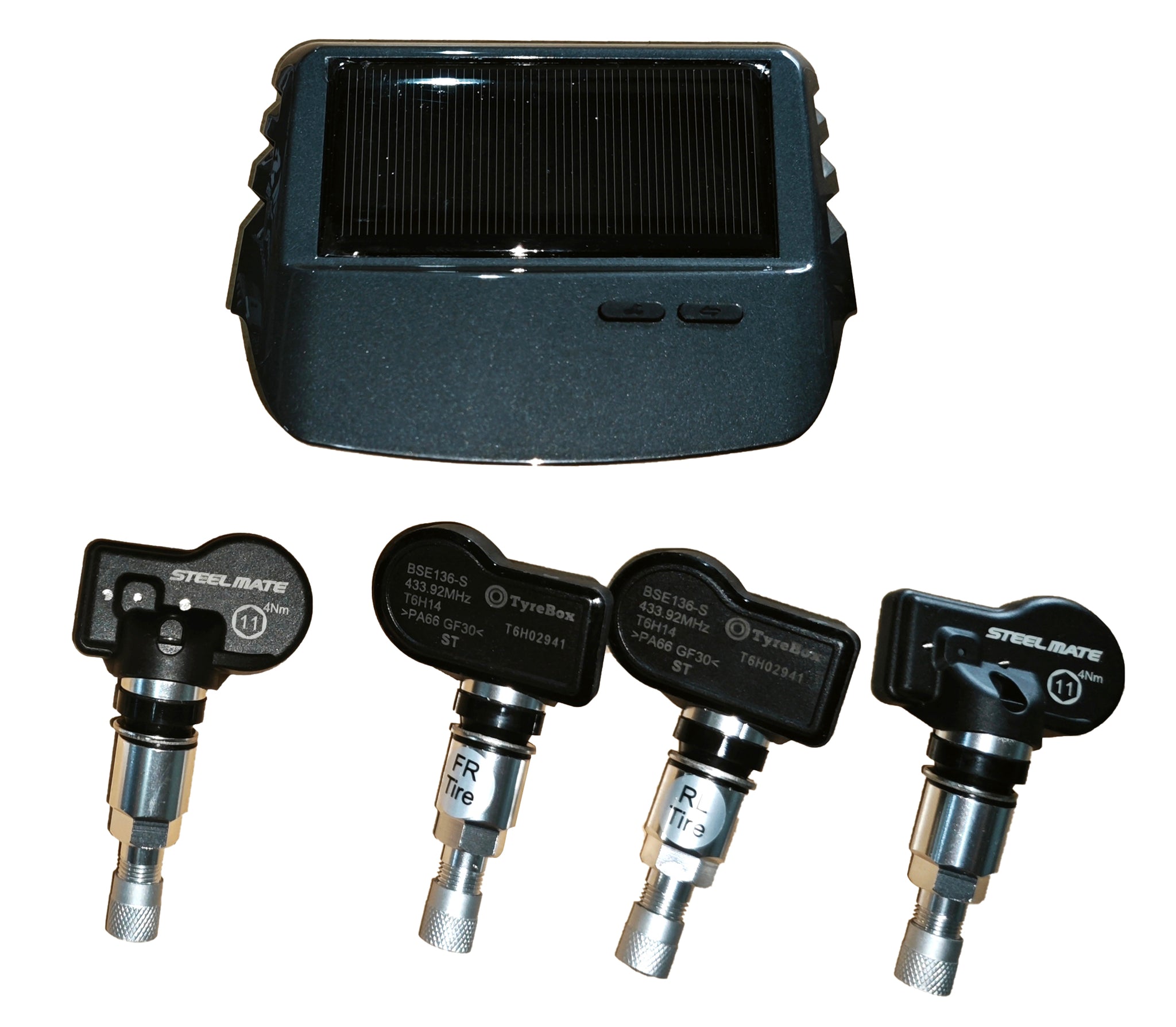 The TP-S15i tyre pressure monitoring system has a solar powered dashmount display in Colour and is supplied with four Internal sensors which displays the tyre pressures of all four tyres in BAR.